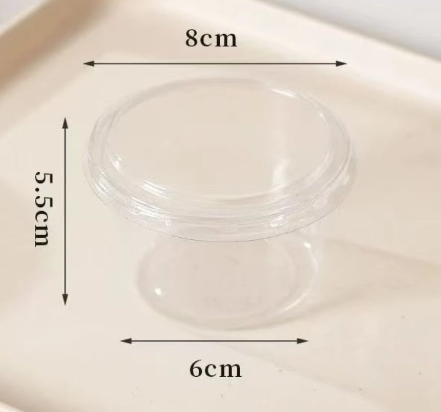 產地: 中國 尺寸: 附圖 上直徑:約8cm x 下直徑:約6cm x 高: 約5.5cm [容量約150ml] 數量: 10個 注意:產品已包含透明蓋,不包含小匙