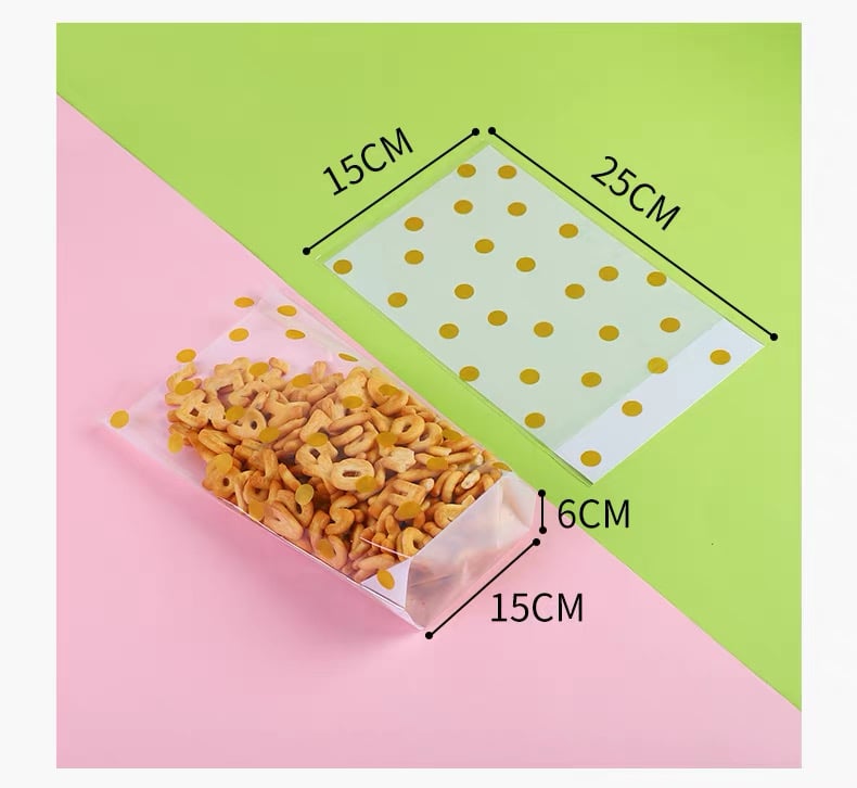 產地 Origin:中國 China 數量:5pcs/pack 或 10pcs/pack *產品正面為高透明+金色波點, 底面為磨砂白色半透 尺寸: 15cm x 25cm (底開約6cm)<附圖片標示